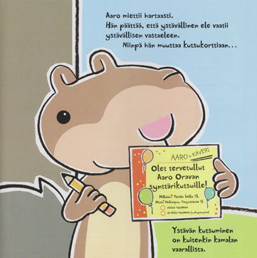 Aaro-orava ei ikinä järjestä suuria synttäreitä. Se on ihan liian vaarallista. Aaro voisi vahingossa törmätä poniin tai lentäviin karkkeihin. Hän päättääkin järjestää kutsut vain itselleen, mutta muuttaa sitten mielensä ja kutsuu luokseen vain yhden kaverin. Kahden hengen kutsut vaativat tarkkaa suunnittelua. Mutta kun juhlapäivä koittaa, kaikki hienon hienot suunnitelmat romahtavat. Selviääkö Aaro hengissä? Kestääkö Aaro musiikkimetelin? Joutuuko hän juhlimaan niin kauan kuin henki pihisee?