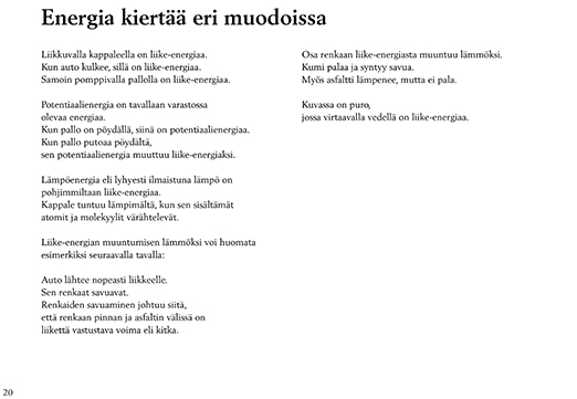 Kirja ei ole oppikirja, mutta sitä voi käyttää luonnontieteen perusopetuksen tukena. Asiat on kuvattu selkokielellä ilman matematiikkaa. Selkeät kuvat auttavat hahmottamaan energian kiertokulkua.