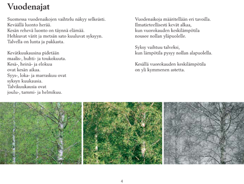 Suomessa vuodenaikojen vaihtelu näkyy selkeästi. Keväällä luonto herää. Kesän rehevä luonto on täynnä elämää. Hehkuvat värit ja metsän sato kuuluvat syksyyn. Talvella on lunta ja pakkasta.