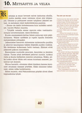 Kirjassa suomenkielisen tekstin rinnalla kulkee englanninkielinen teksti. Täten kirja on mainio apuväline suomen tai englannin opiskelussa.