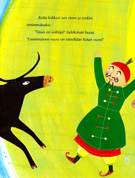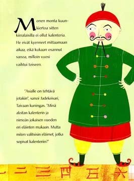 "Minä taidan järjestää kilpailun", Jadekeisari miettii. "Järjestän uintikilpailun leveän joen yli. Nimeän jokaisen vuoden siinä järjestyksessä, kun eläimet tulevat maaliin."